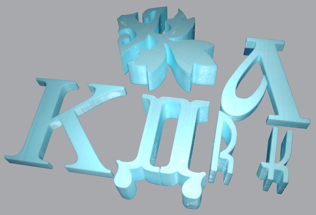 - обработка пенополистирола – выполнение всевозможных 2D узоров, элементов дизайна, букв, символов, логотипов для наружной и внутренней рекламы.